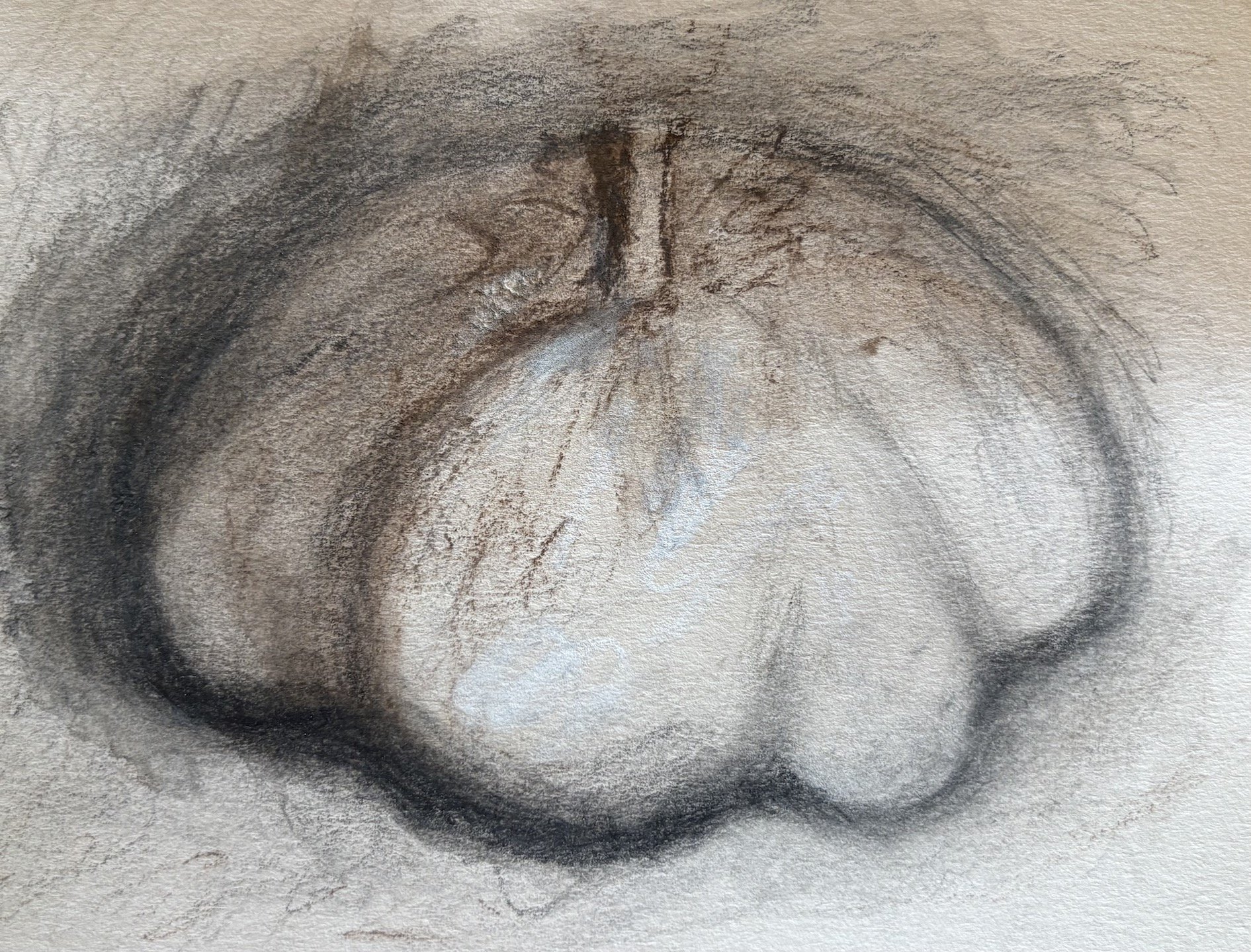 It’s important that I mention mindful drawing as well, the close observation of a given subject. Slowing down and and spending more time just seeing makes us more connected to our environment. Keeping a visual record of “observations” serves a similar function as a daily journal. This approach trains the eye to look carefully, taking notice of the subtle nuances that are easily overlooked in “autopilot”. I have an example here of a gourd drawing, a clear contrast to the expressive drawing. Both techniques complement one another and will have a great impact on your artwork.
