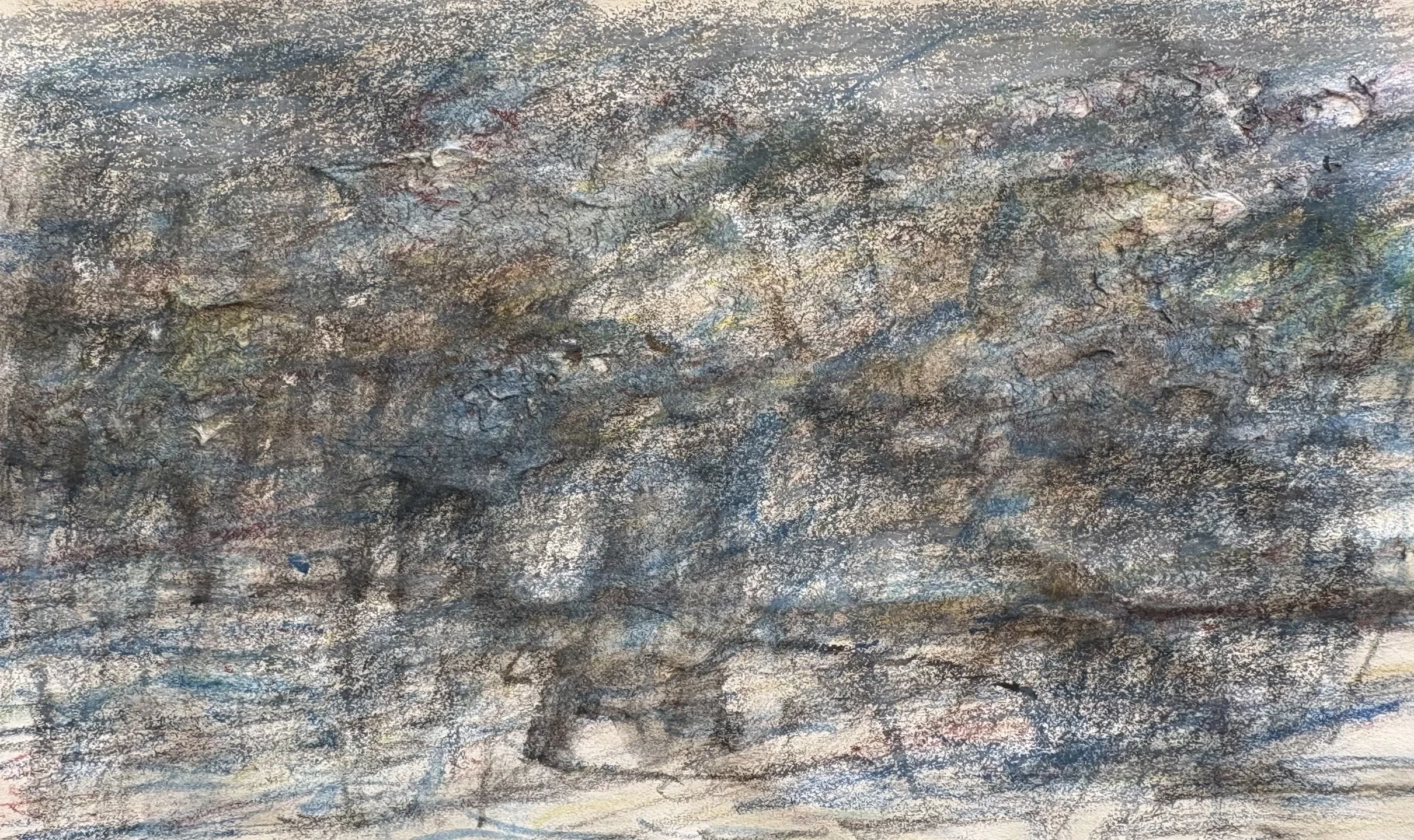 I began with a light sketch using a vine charcoal stick and then transitioned to watercolor crayons, allowing loose, random lines to emege into a landscape. I particularly noticed there was far less pressure than when working on a canvas—it felt easier to experiment using less material without the fear of “mistakes”. I then added water in places with a brush to blend sections of the drawing. Bore I knew it, I had completely lost track of time for over an hour, watching unexpected elements reveal themselves.